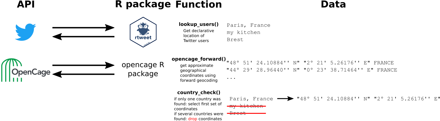 For this purpose, I wrote the country_check() function. This function extracts the components.country variable, and checks if it is unique. If it is unique, i.e. there is either only one set of geographical coordinates or there is several but they all are located in the same country, the function keeps the first set of coordinates. Otherwise, it returns NA.