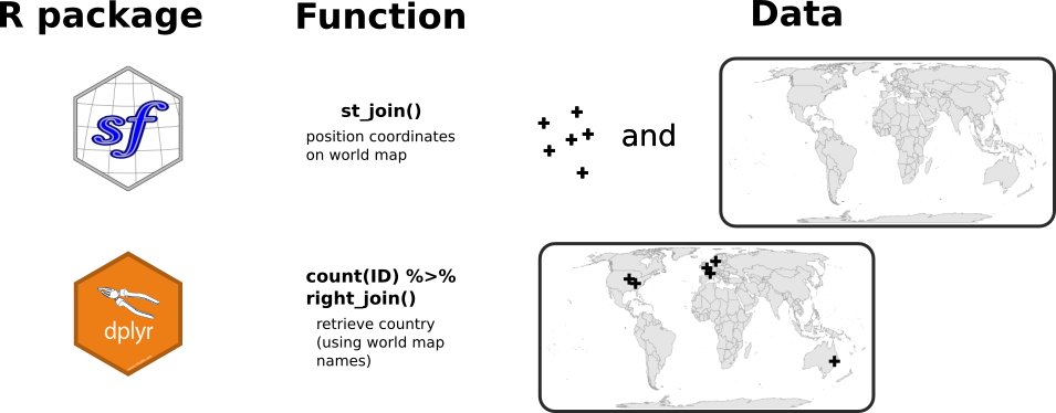 In the figure below, I summarise the two steps needed to display the users location on the world map. I already have a country information coming from the results of the OpenCage API request. However, I am not sure that the names of the countries in OpenCage corresponds to the names I have in the world map from {rnaturalearth}. For instance, I could have USA in one and United States of America in the other. The strategy here is to (1) join the set of geographical coordinates on the world map using the st_join() function from {sf}, and then, (2) use the countries from the world map on which these points are located.