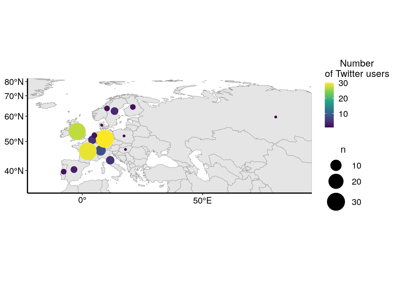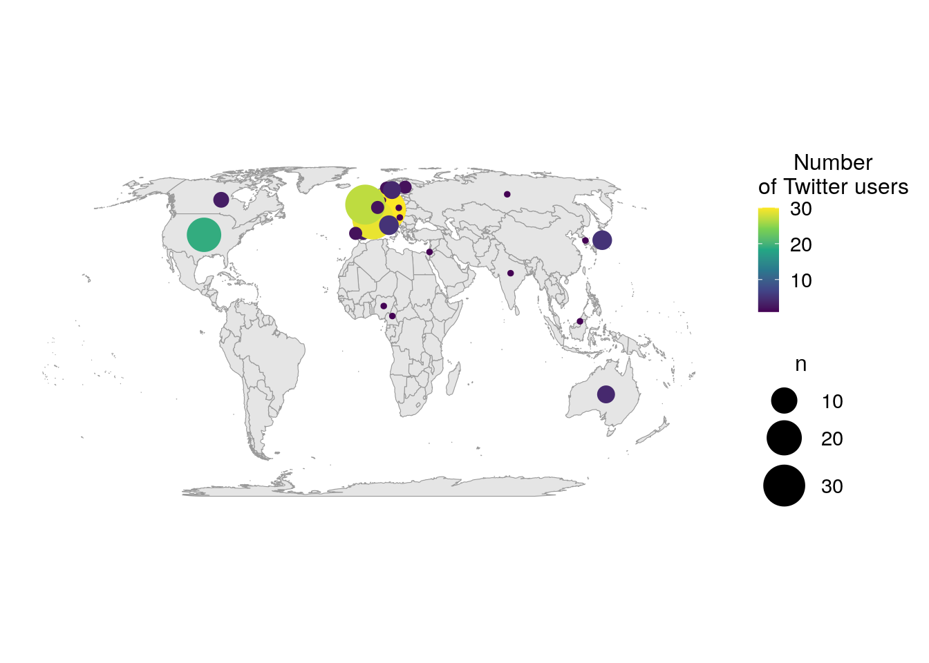 I can now join the geographical information with the users data. The query saved by opencage_forward() does not exactly match the character string stored in user_info. To make a clean junction between the users’ information and the location encoded by forward geocoding, I first clean the location and query columns using the following functions from the {stringr} package: str_trim(), which removes whitespaces from start and end of a string, and str_to_lower(), which converts a string to lower case.