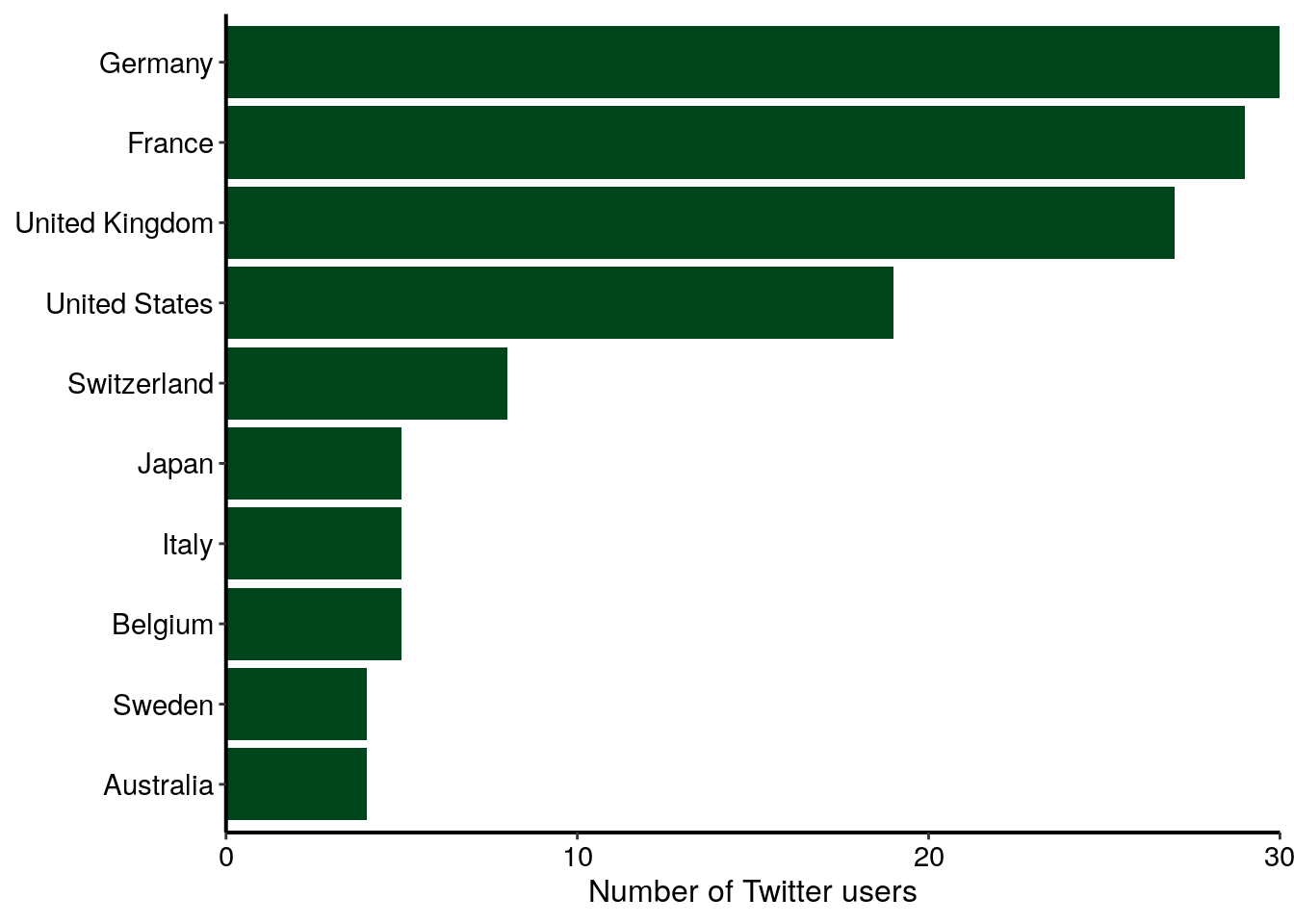 As explained above, I expected a quite high number of Twitter users from Europe. Interestingly, there is also many users from the USA, but also from other countries, like Canada, Australia or Japan. The barplot below shows the number of Twitter users for the top ten most represented countries in my dataset. I can reasonnably suppose that not all Twitter users that used the conference hastags were at the conference. Thus, the graph below represents more the internationnal echo that this conference had on Twitter rather than the origin of conference participants.